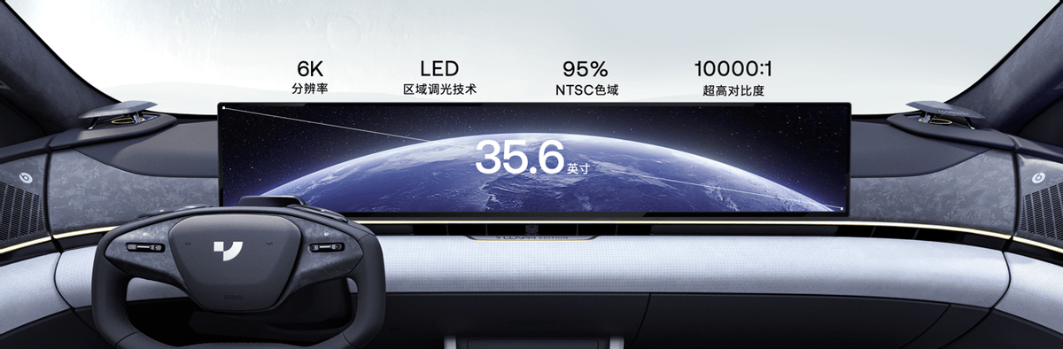 35.6英寸6K超清一体屏,不分裂、不遮挡、不拼接,具有95%NTSC高色域和10000:1超高对比度,是最具未来感的3D无界一体化大屏。超清一体屏作为整车AI感应式交互进口,可以供给最佳的沉溺式3D视觉HMI和文娱体会。后排装备7英寸交互显示屏,给用户带来第三生活空间的客舱关心。