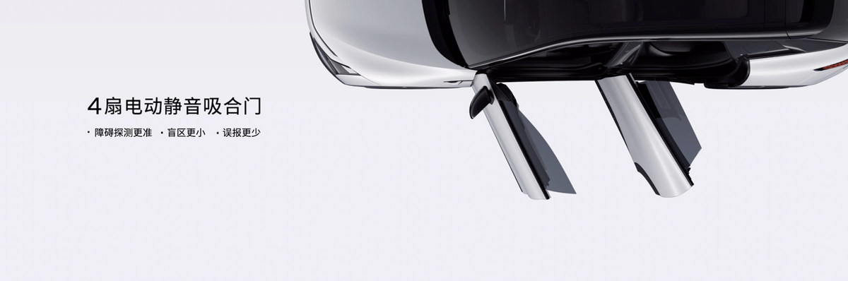 全车无车外门把手规划,4扇电动门装备静音吸合功用。车门集成4颗毫米波雷达,比较超声波雷达避障更精准,盲区更小、误报更少。