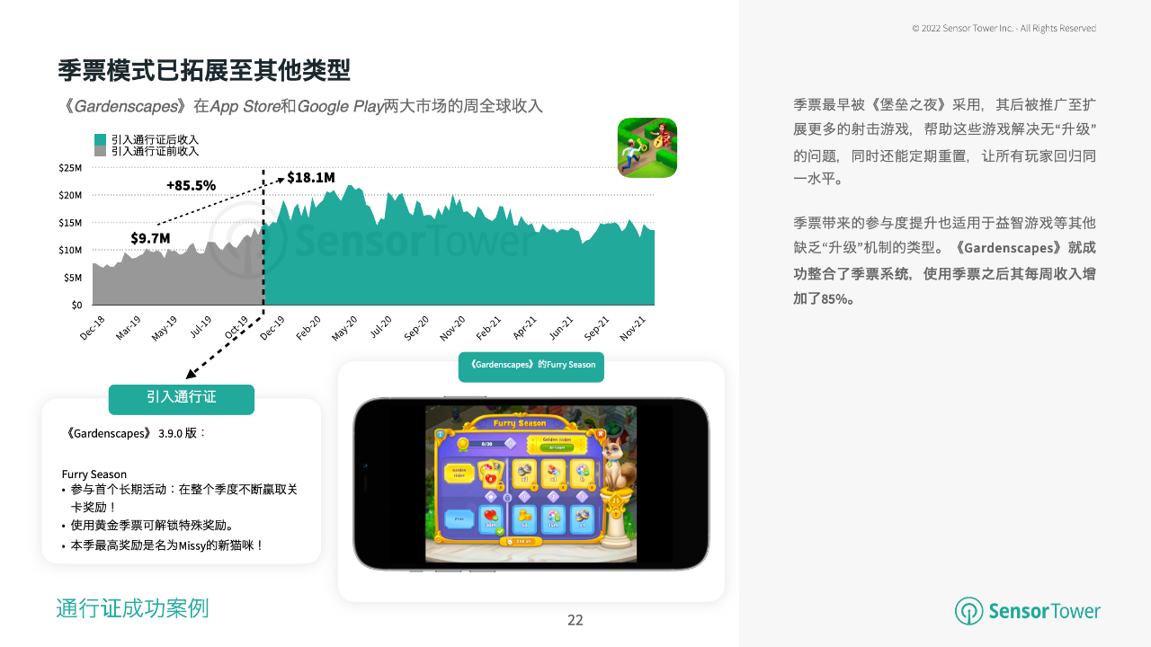 依据Sensor Tower发布的陈述,2021年,全球有一半的热销游戏现已参加根据通行证的变现机制,包含腾讯的《PUBG Mobile》和《王者荣耀》,以及米哈游的《原神》。在收入最高的游戏中,选用通行证作为一种变现办法的大多是中度游戏。尽管如此,有些休闲游戏也开端参加通行证,包含King的《糖块传奇》,以及Playrix的《Homescapes》和《Gardenscapes》。