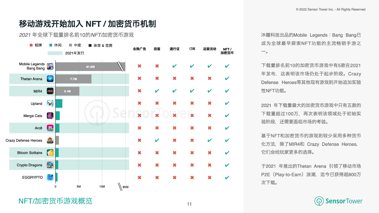 NFT和加密机制在移动端的占比正在生长,一系列新老移动游戏都开端测验这种办法。运用区块链技能且下载量最高的10个游戏中,有5款是2021年发布的,其间体现最好的是来自WolfFun 的《Thetan Arena》,迄今为止已被下载超越800万次。Animoca Brands出品的《Crazy Defense Heroes》等其他游戏亦开端追加NFT。