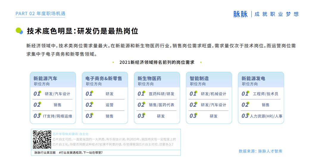 新经济范畴中,技能类岗位的需求量最大。从数据来看,新能源轿车、重生物医药、电商&新零售、智能制作以及新能源发电等作业,研制/技能类职位都是排名榜首的需求岗位。