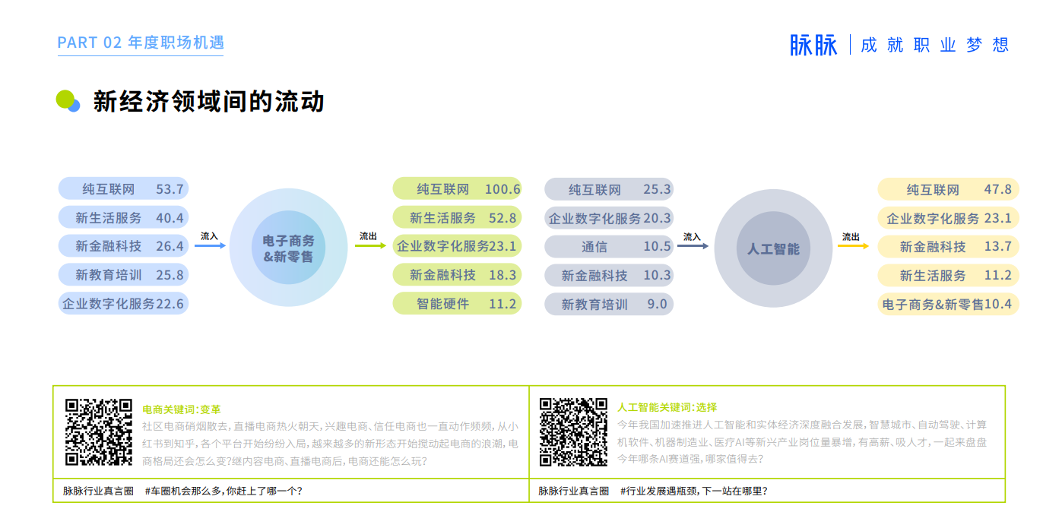 林凡泄漏,上一年以来脉脉开端测验从互联网作业向新经济范畴浸透。在人才净流入维度来看,互联网与新经济范畴呈现两个改动: