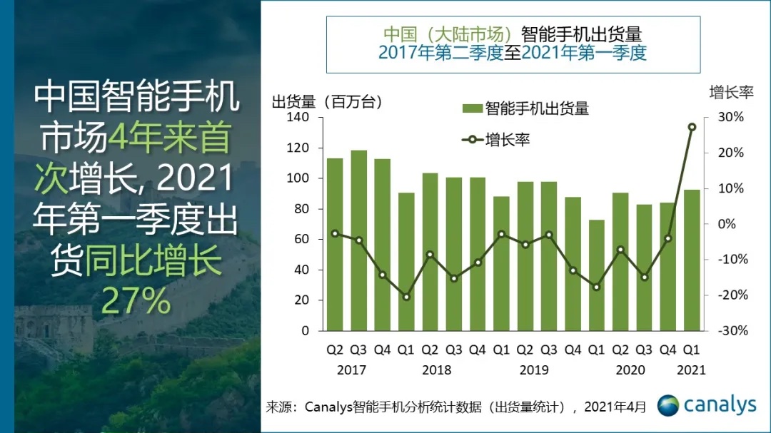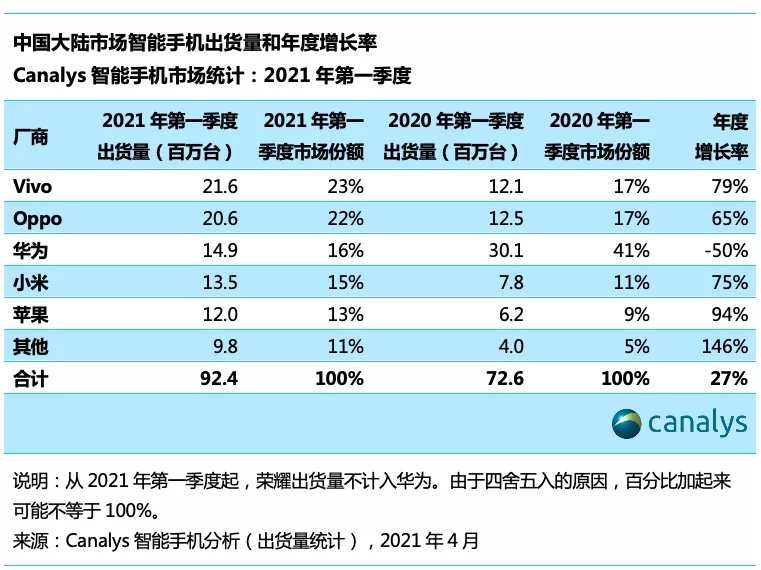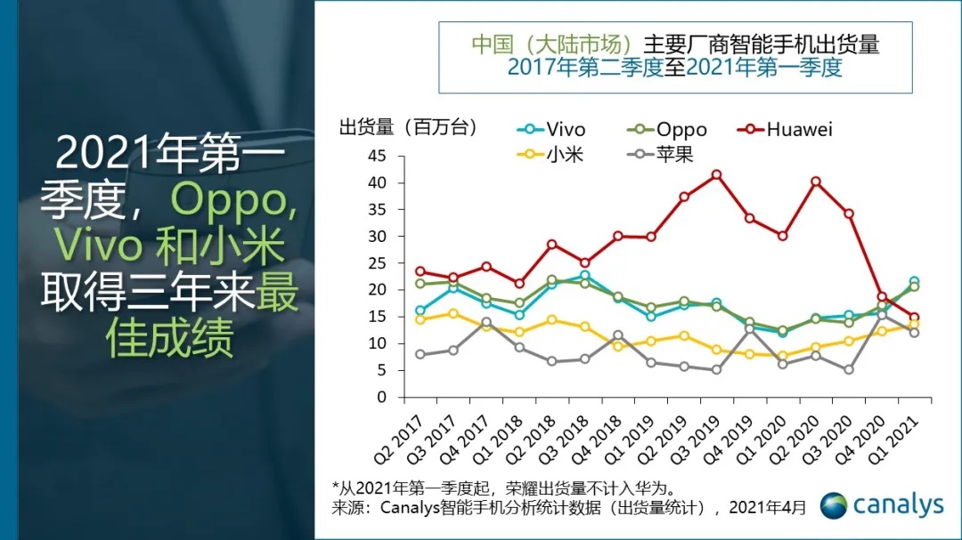 ,我国大陆智能手机商场在新冠疫情一周年之际总算康复到 2019 年榜首季度的水平。智能手机出货量到达 9240 万部,同比增加 27%。vivo 从华为手中夺得国内商场桂冠,出货同比陡增 79%,到达 2160 万台。OPPO 以 2060 万台出货名列第二。华为下滑至第三,2021 年榜首季度出货 1490 万台(独立后的荣耀以近 500 万台位居第六)。小米和苹果排列第四和第五位,别离出货 1350 万台和 1200 万台。“我国智能手机商场重拾了往日的昌盛,”Canalys研讨分析师Amber Liu表明,“抢先玩家们竞相发力冲向商场巅峰,与 2020 年第 1 季度乃至 2020 年第 4 季度比较,本季度智能手机的发布数量反常之多。跟着顾客和途径对代替品牌持愈加敞开的情绪,美国对华为的制裁与荣耀的独立成为了商场新一轮增加的标志。”