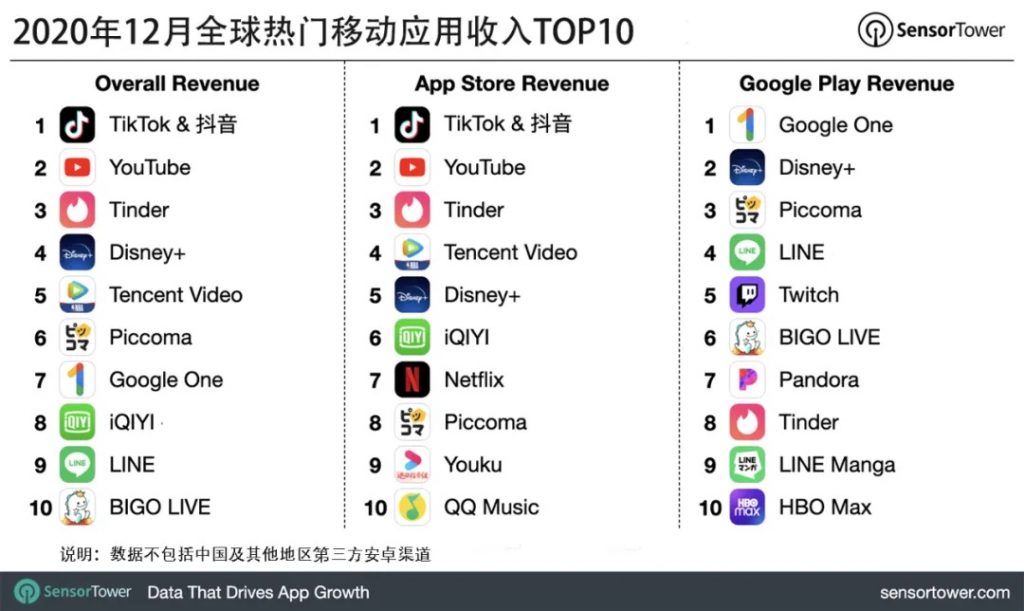 ,2020 年 12 月抖音及海外版 TikTok 在全球 App Store 和 Google Play 吸金近 1.42 亿美元,是上一年 12 月的 3.3 倍,再次连任全球移动使用(非游戏)收入榜冠军。其间,大约 86% 的收入来自我国版别抖音;美国商场排名第二,贡献了 7% 的收入;土耳其商场排名第三,占 2%。