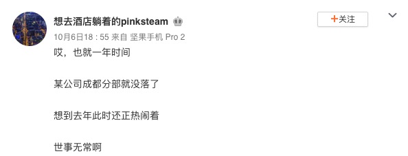 发布音讯称,“也就一年时刻,某公司成都分部就衰败了”。有用户指出,发微博的人是锤子科技前期职工王前闯,而“某公司”指的应该便是锤子科技。